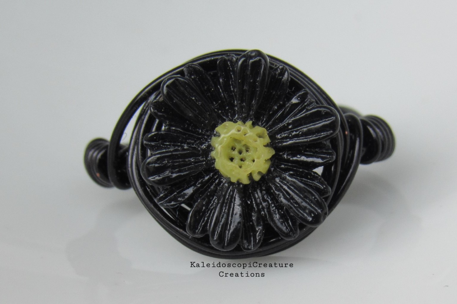 This listing is specifically for a wire wrapped ring using black wire, and a black sunflower with a yellow center.