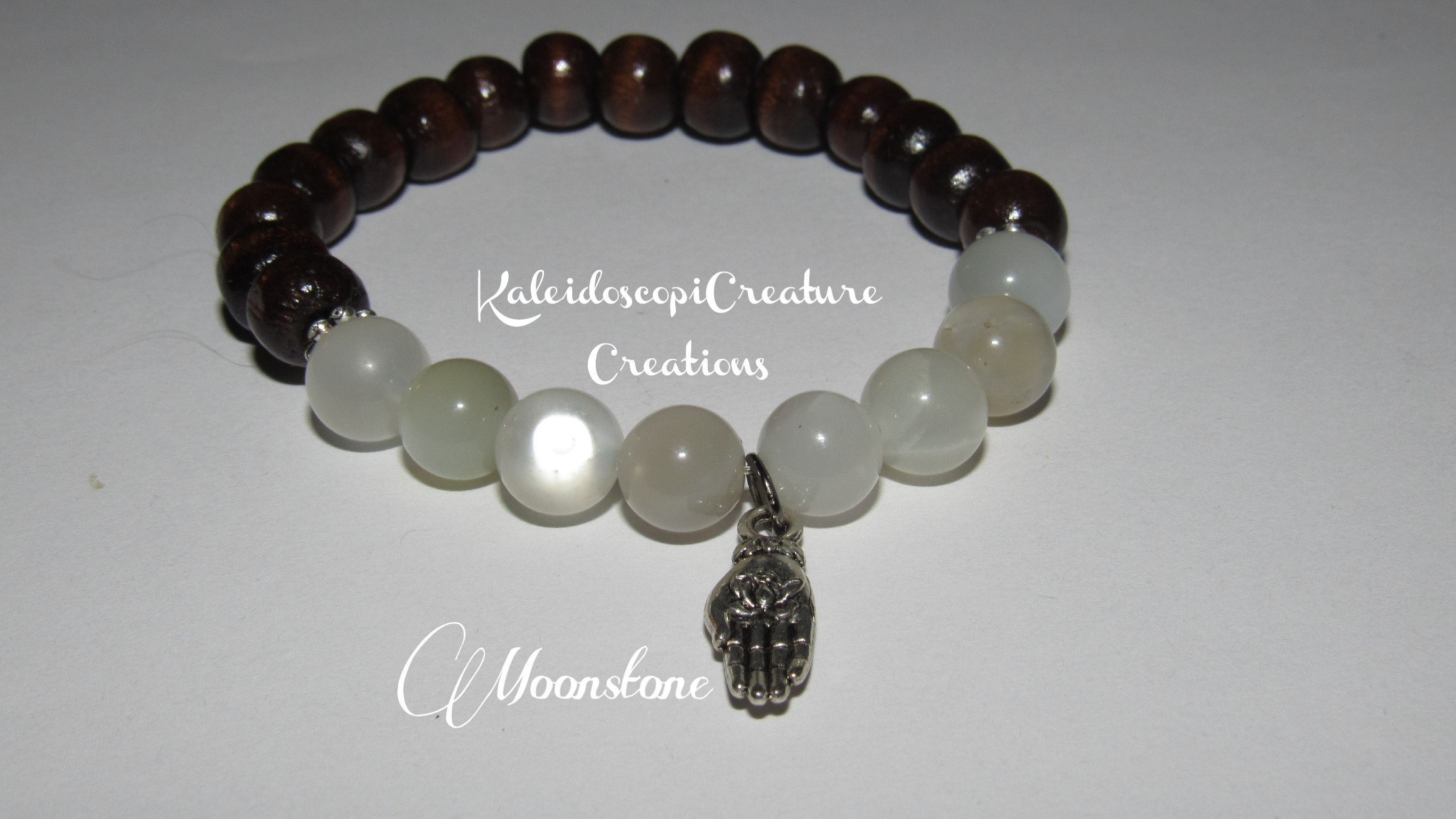 Bracelet featuring white moonstone beads with silver Tibetan hamsa hand with lotus flower charm.